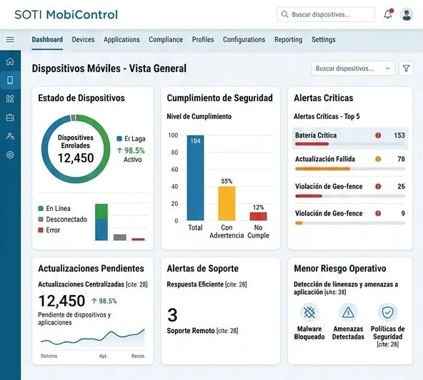 Administración remota y control sobre la flota completa de dispositivos.